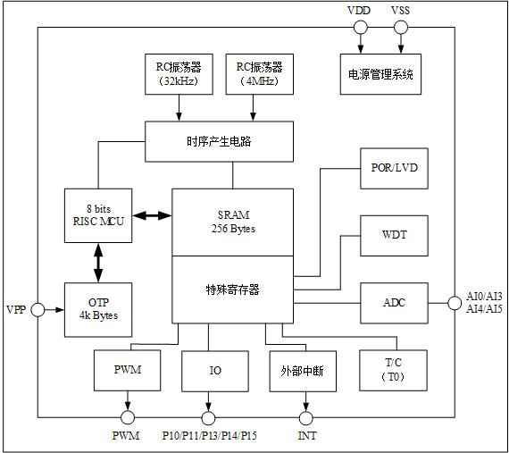 8位RISC超低功耗MCU,49条指令,6级堆栈,MCU部分在2MHz工作时钟,3V工作电压下 电流典型值为300μA; 32kHz时钟待机模式下工作电流2μA,休眠模式电流典型值为1μA