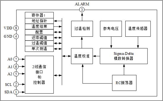 SD5075是一款高准确度温度传感器芯片,内含高精度测温ADC,在-40~+100℃范围内典型误差小于±0.5℃,在-55~+125℃范围内典型误差小于±1.0℃。通过两线I2C/SMBus接口可以很方便与其他设备建立通信。设置A2~ A0的地址线,可支持8片芯片并联总线连接。本芯片可选3种工作模式:连续测温模式,单次测温模式,关断模式。可根据速度或功耗的需求灵活选择和配置。