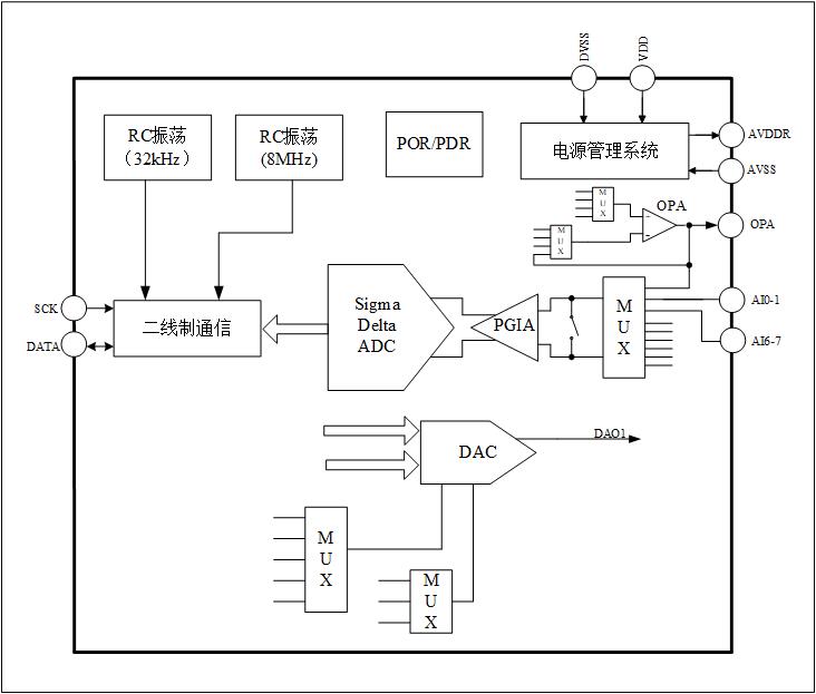 本芯片还内置温度传感器,8bits DAC等,可满足多种应用的要求。