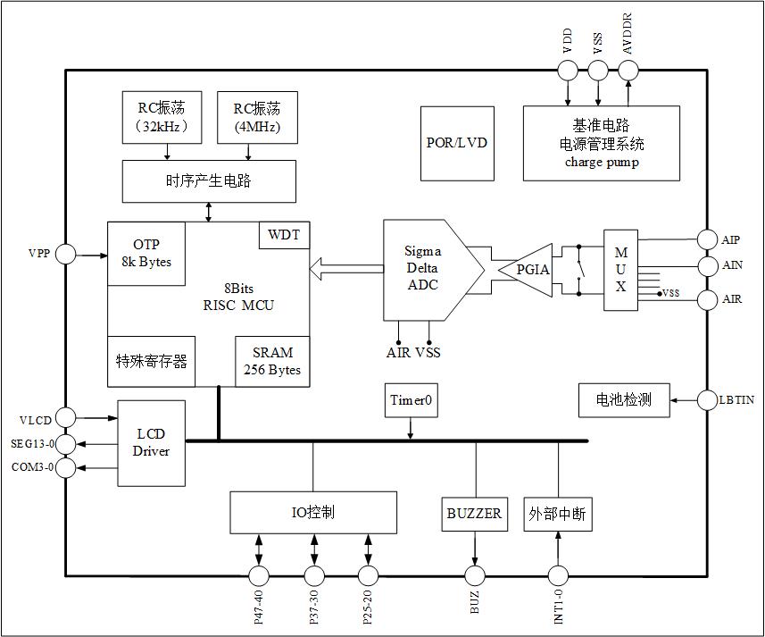 8位RISC超低功耗MCU,49条指令,6级堆栈,在2MHz工作时钟,MCU部分在3V 工作电压下电流典型值为500μA; 32kHz时钟待机模式下工作电流1.5μA,休眠模 式电流典型值为1μA