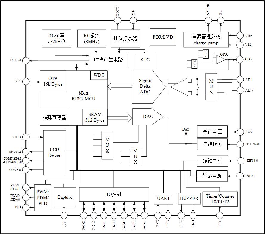 8位RISC超低功耗MCU,49条指令,6级堆栈,在2MHz工作时钟,MCU部分在3V 工作电压下电流典型值为400μA; 32kHz时钟待机模式下工作电流1.5μA,休眠模 式电流小于1μA