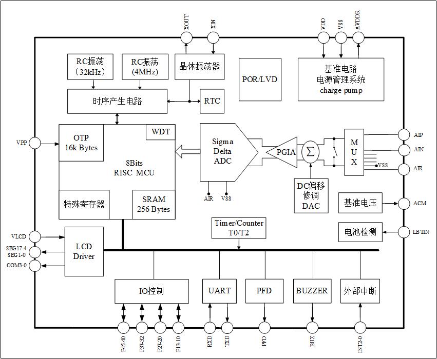 8位RISC超低功耗MCU,49条指令,6级堆栈,在2MHz工作时钟,3V工作电压下 电流典型值为600μA; 32kHz时钟待机模式下工作电流1.8μA,休眠模式电流典型 值为1μA