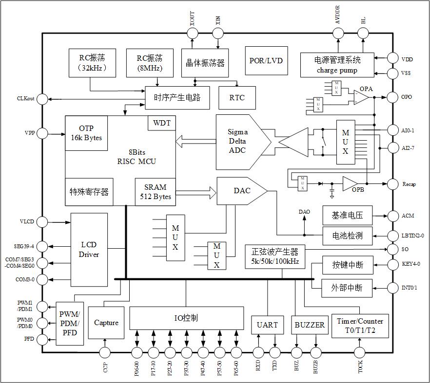 8位RISC超低功耗MCU,49条指令,6级堆栈,在2MHz工作时钟,MCU部分在3V 工作电压下电流典型值为400μA; 32kHz时钟待机模式下工作电流1.5μA,休眠模 式电流小于1μA