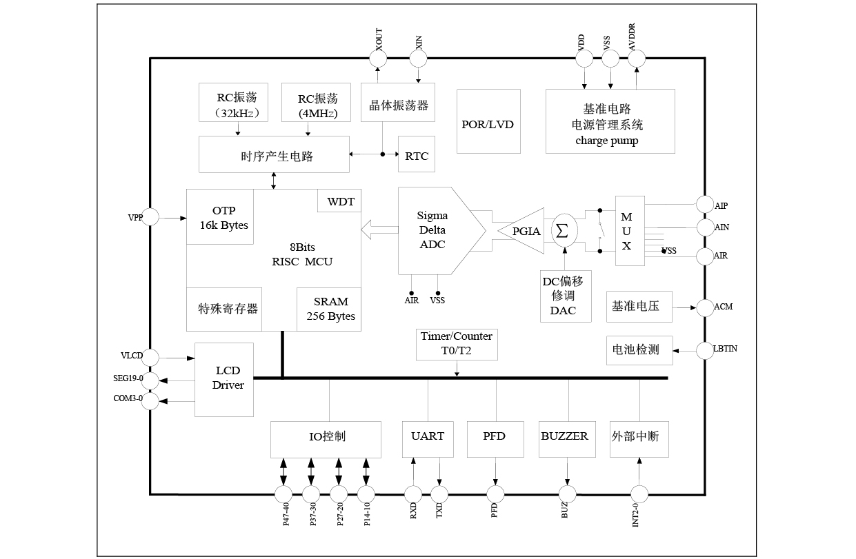 8 位 RISC 超低功耗 MCU, 49 条指令, 6 级堆栈, 在 2MHz 工作时钟, 3V 工作 电压下电流典型值为 600μA; 32kHz 时钟待机模式下工作电流 1.8μA, 休眠模式 电流典型值为 1μA