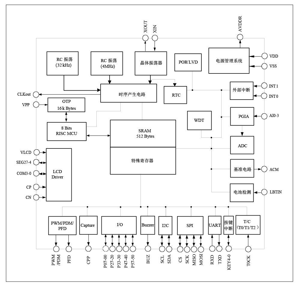 本芯片是高精度 24 位 ADC 的 SoC 产品,外围资源丰富:RTC, 可选的多种稳压电源输出,灵活设置的 PGIA 模块,升压模块, UART、 I²C、SPI、 TIMER、 PWM/PDM、 PFD、 CAPTURE 输出模块, LCD 驱动等。