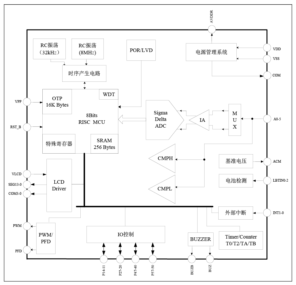 外围资源丰富:可选的多种稳压电源输出,灵活设置的 ADC 模块,升压模块, UART, 带有CAPTURE功能的TIMER, PWM和PFD输出模块,LCD 驱动等。