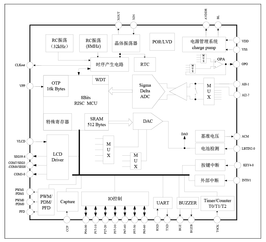 8 位 RISC 超低功耗 MCU, 49 条指令, 6 级堆栈,在 2MHz 工作时钟, MCU 部 分在 3V 工作电压下电流典型值为 400μA; 32kHz 时钟待机模式下工作电流 1.5μA, 休眠模式电流小于 1μA