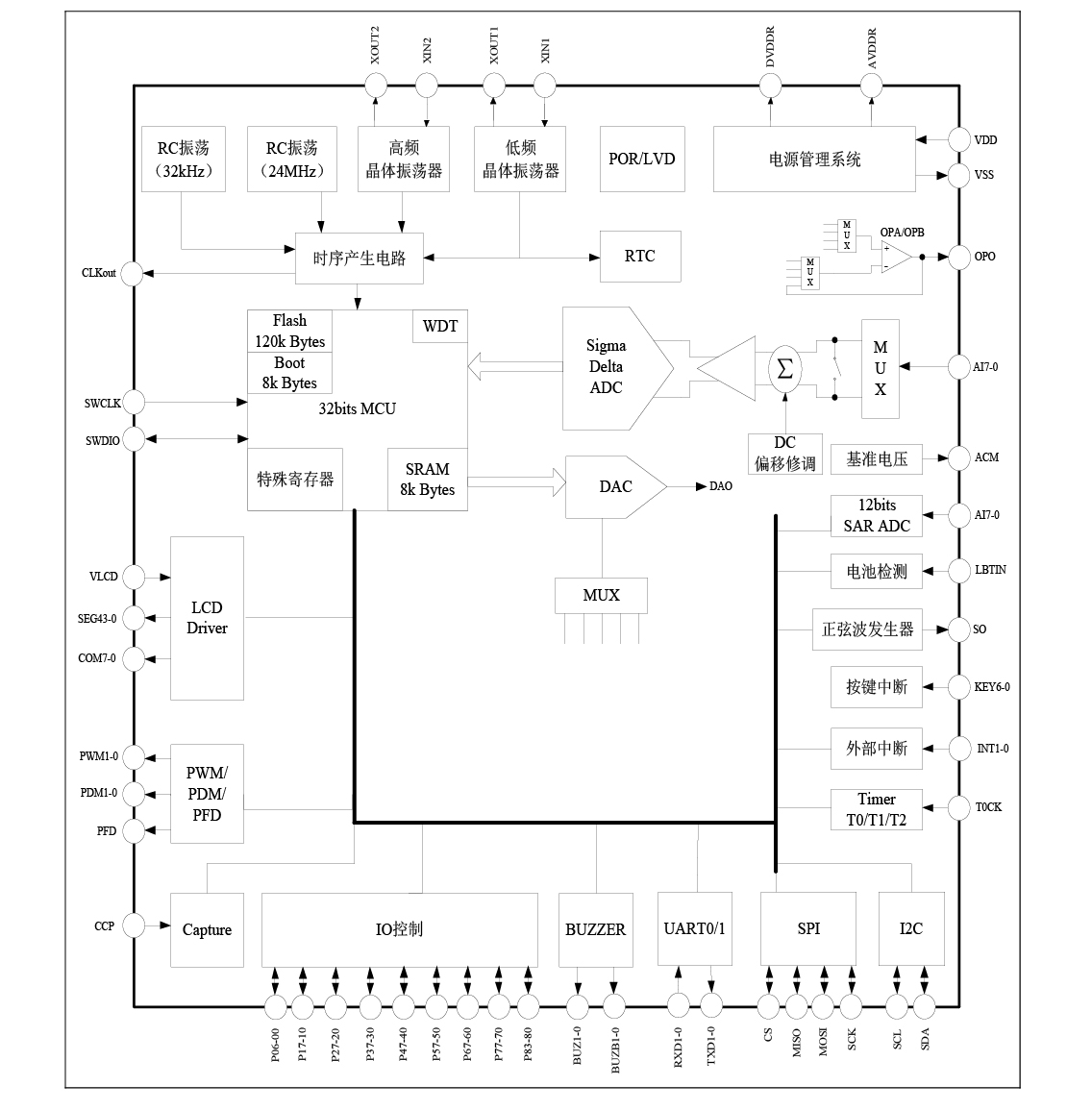 本芯片是带有 LCD 驱动和 24 位高精度ADC 的 32 位 MCU 的 SOC 产品,提供 120KBFlash 空间用于存储用户程序。