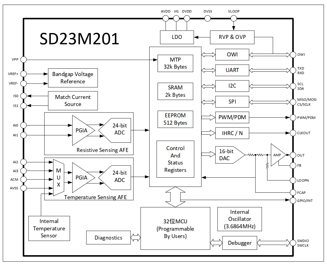 内置位微控制器,支持用户开发和实现校准补偿算法:32位MCU;内置3.6864MHz RC振荡器,校准后误差小于±1%;带硬件乘法器;支持串行线下载和调试