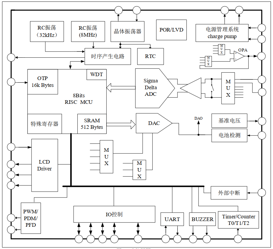 8位RISC超低功耗MCU,49条指令,6级堆栈,在2MHz工作时钟,MCU部分在3V 工作电压下电流典型值为400μA; 32kHz时钟待机模式下工作电流1.5μA,休眠模 式电流小于1μA